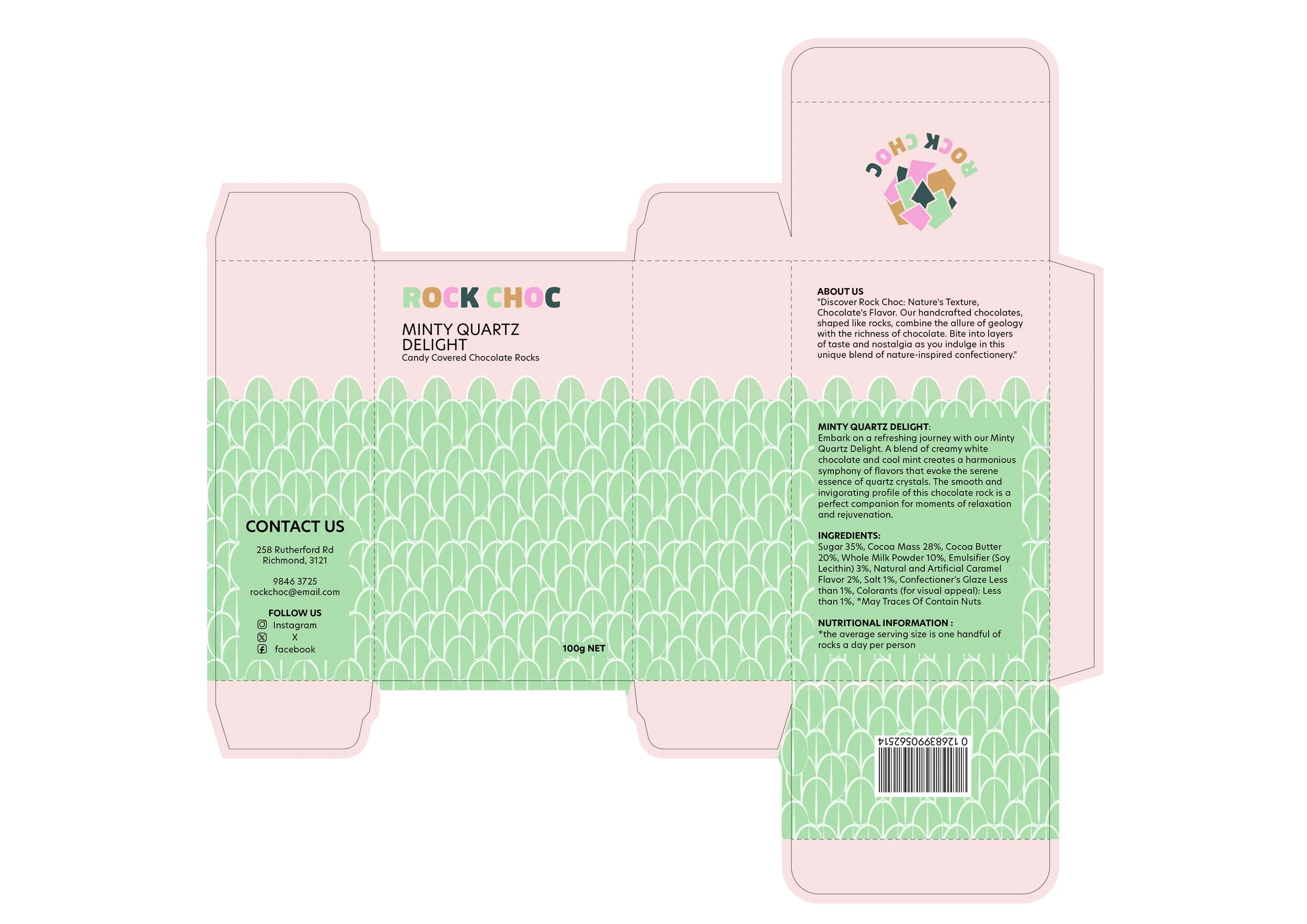 Rock Choc is a new and exciting chocolate company, these are the three packs for their new products. They are handcrafted chocolates, shaped like rocks, combine the allure of geology with the richness of chocolate. Bite into layers of taste and nostalgia as you indulge in this unique blend of nature-inspired confectionery.